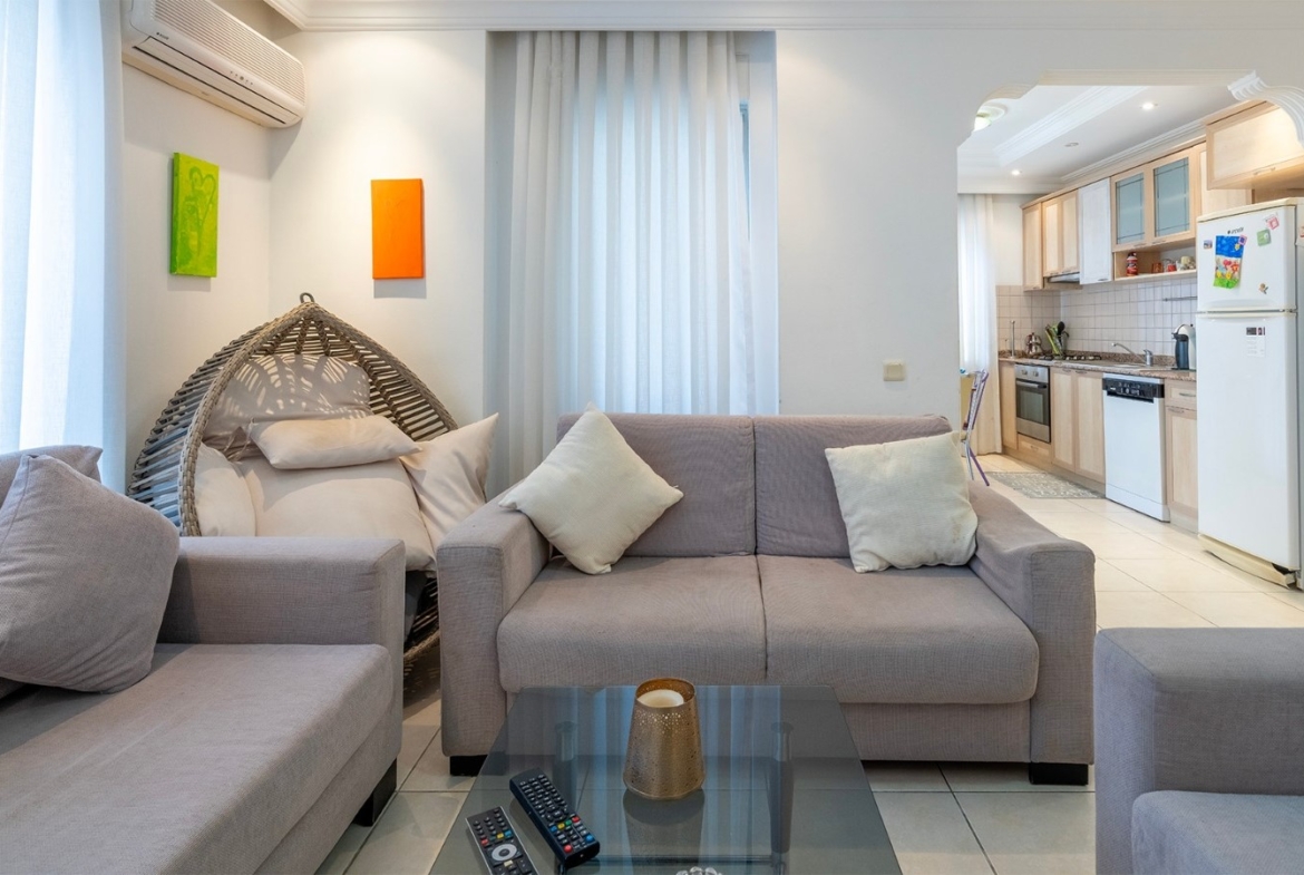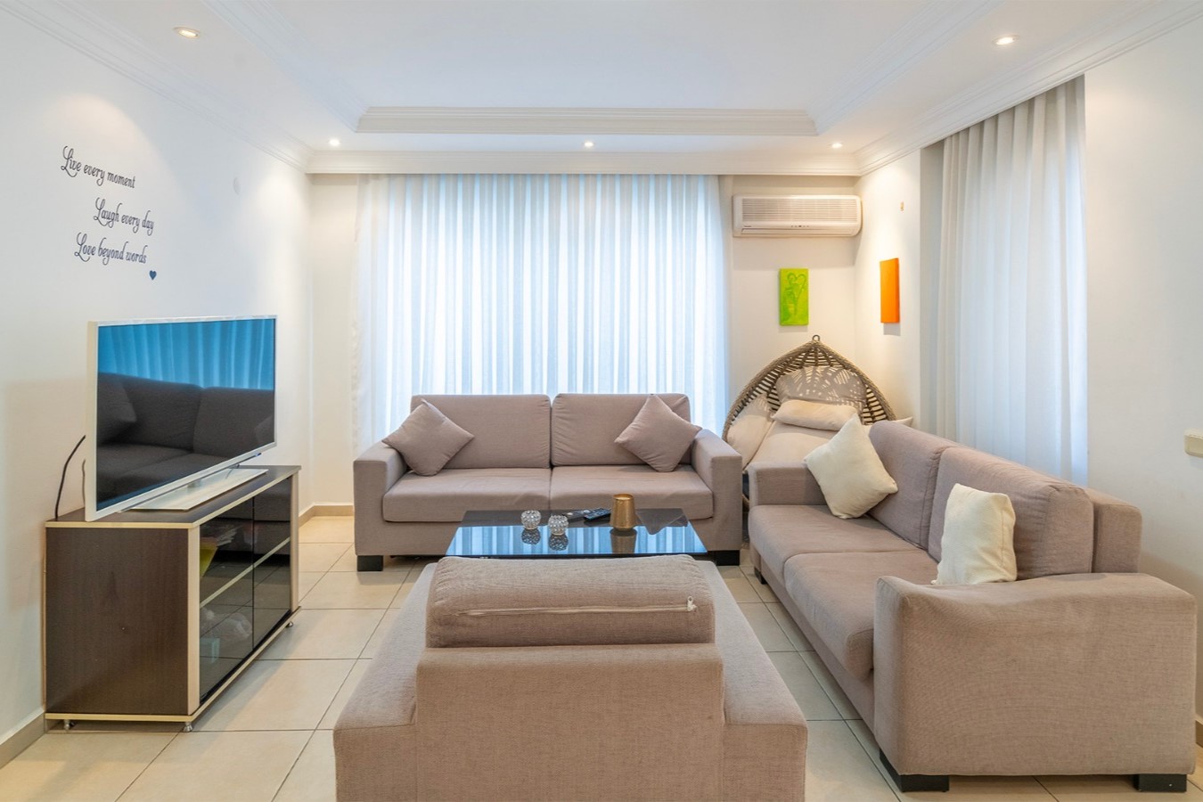Diese Obagol 2-Zimmer-Wohnung befindet sich in Zümrüt Evleri, nur 400 Meter vom Meer entfernt. Es befindet sich im 3. Stock eines gepflegten Gebäudes aus dem Jahr 2007. Die Wohnung ist 110 m² groß und verfügt über zwei Balkone, ein Badezimmer und ein separates WC. Es ist nach Norden ausgerichtet und bietet Zugang zu einem Pool und einem Generator.