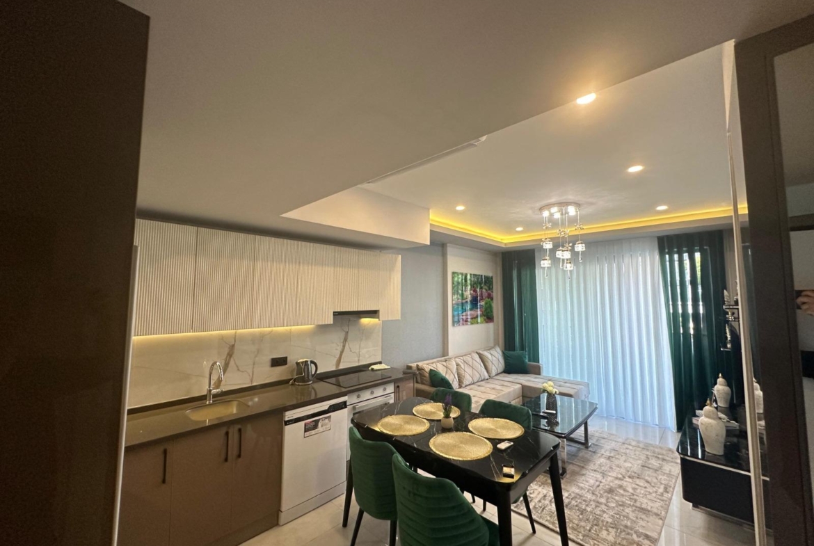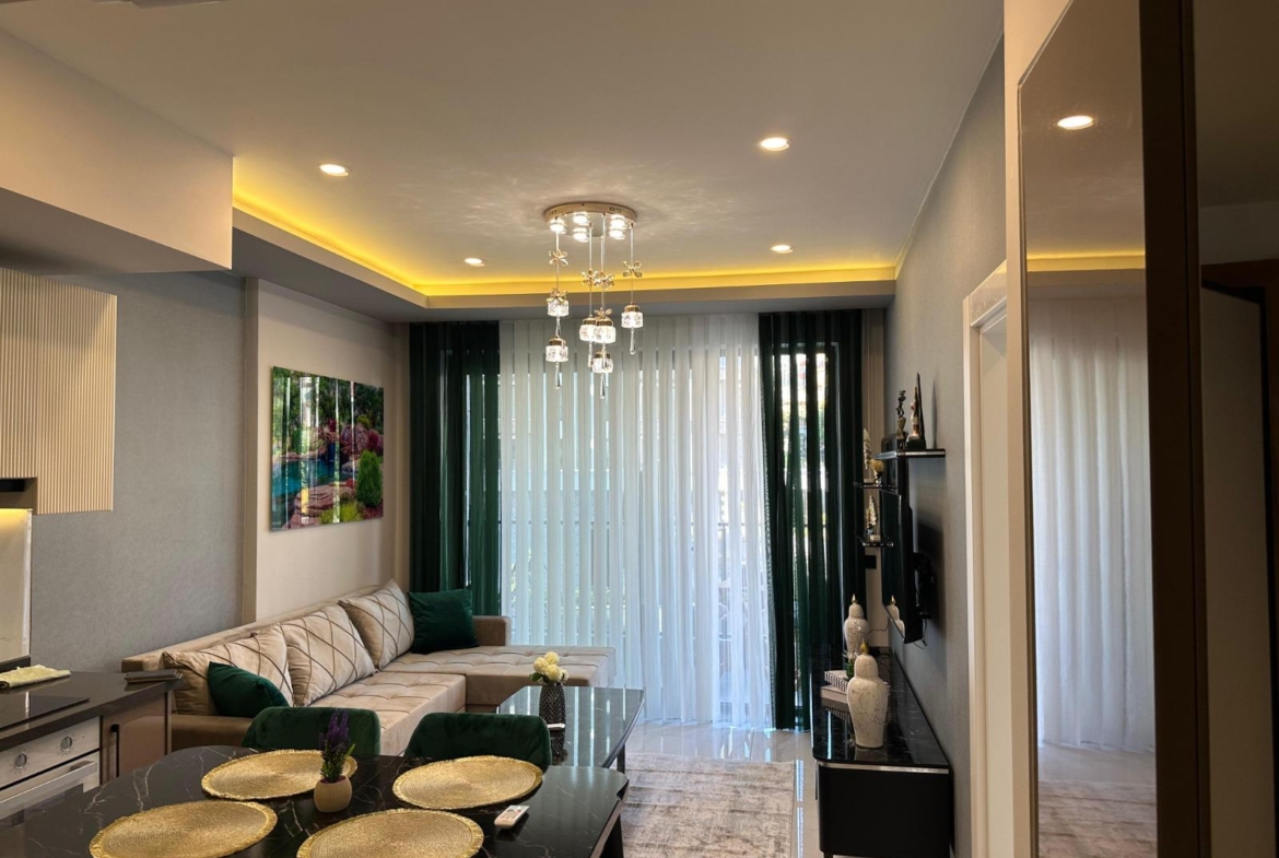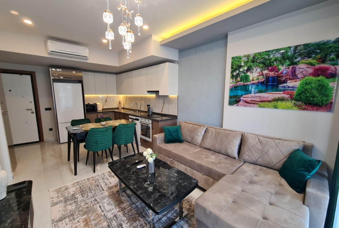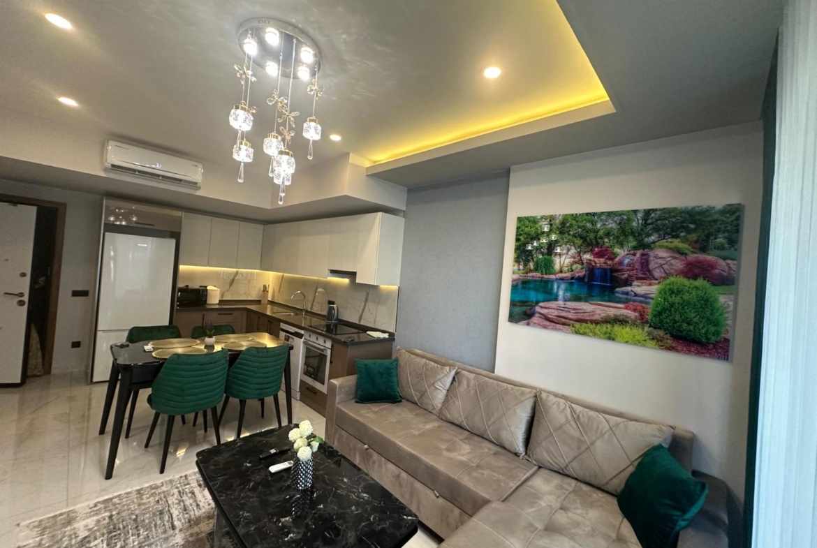 This Alanya center modern apartment in Royal Towers offers convenience in Alanya’s bustling center. The 1+1 apartment, spanning 55 m² on the 1st floor of A-Block in a 9-story building, includes one bedroom, one bathroom with WC, and a balcony. It’s unfurnished, ready for your style. The complex features an open pool, indoor pool, children’s pool, fitness center, sauna, hammam, restaurant, pool bar, gazebo relaxation areas, barbecue zone, and children’s playground. Built in 2024 with a low 65€ monthly maintenance fee, this Alanya center modern apartment is 800 meters from the sea. Gazipasa Airport is 40 km away, and Antalya Airport is 125 km.