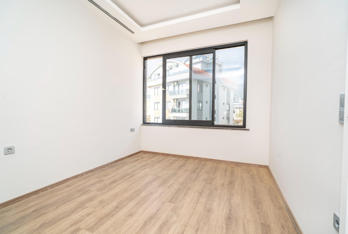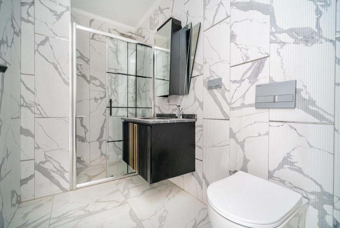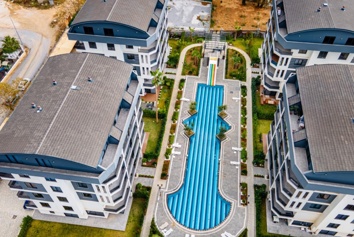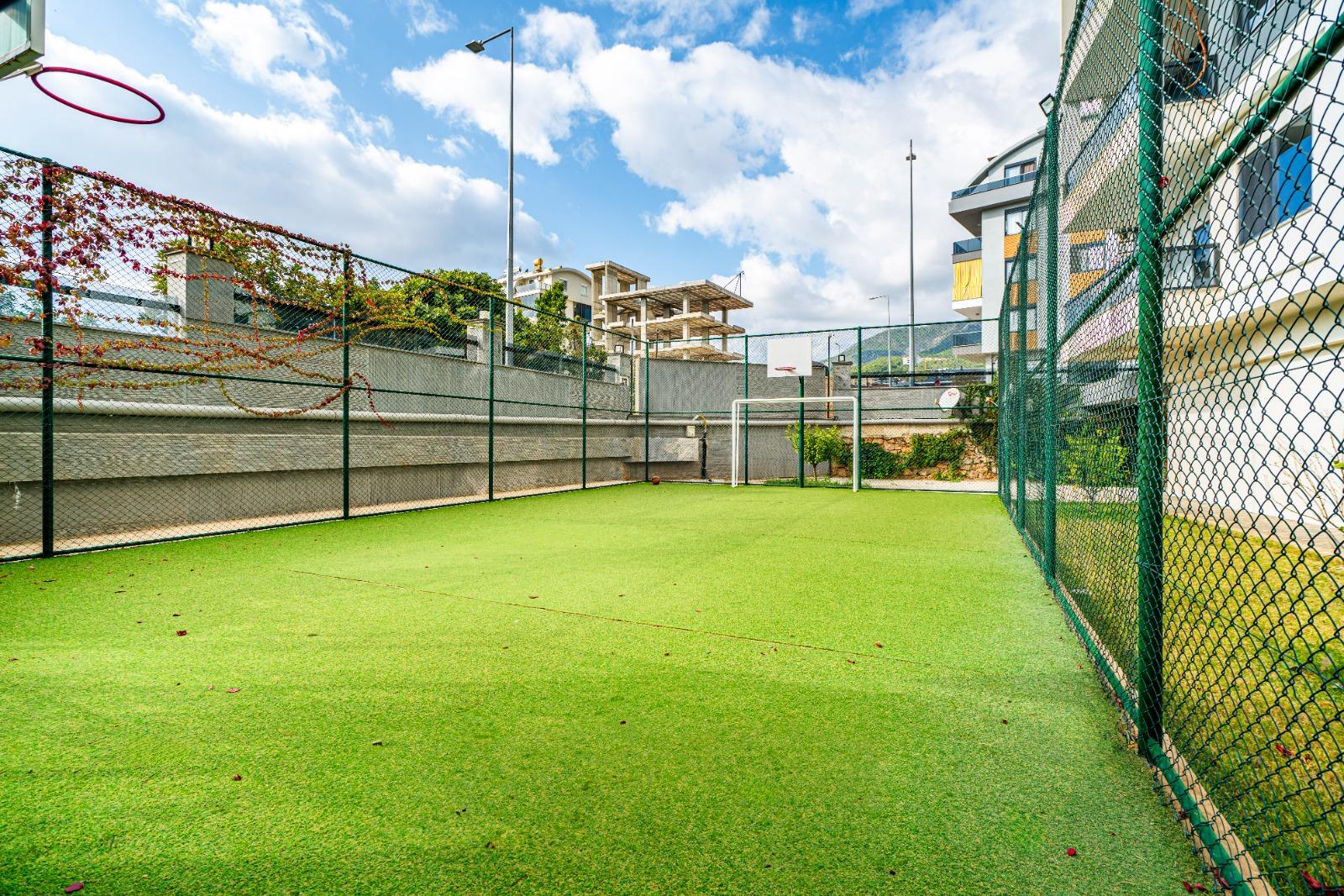 The complex offers outstanding features: a 300 m² pool, water slide, heated jacuzzi, massage rooms, Turkish bath, sauna, fitness room, cinema, kids’ playroom, and bar. Sports lovers will enjoy tennis, basketball, volleyball courts, and a gym. There is 24/7 security, cameras, a generator, and parking for 62 cars. This Alanya Oba flat sale is priced for quick action—ideal for investment or vacation living.